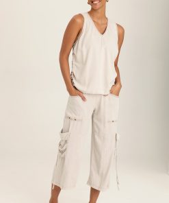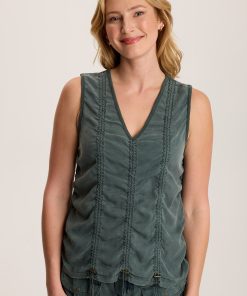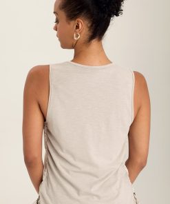 A pretty tank with unusual details. Ileana features a cinchable side seam with brass stopper and a contrast back panel.